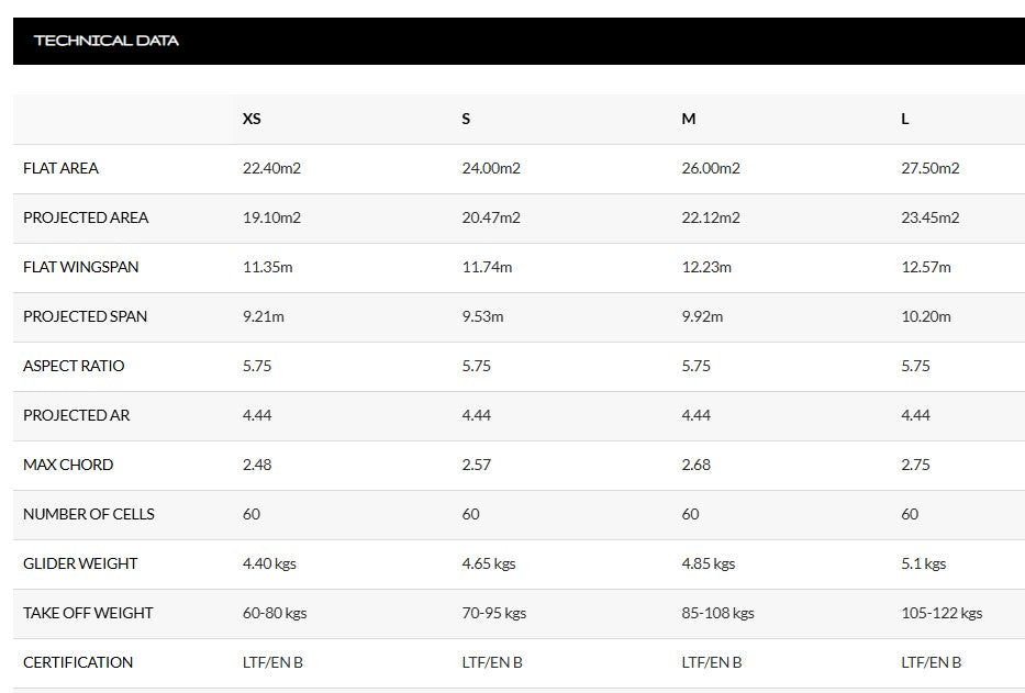 Pitch stability, airfoil solidity, easy and efficient rear riser steering, easy launching and good flare, good top end speed, excellent glide, refined roll and bank in thermals, good feedback pressure through brake line and handles, light speed bar pressure and light and durable canopy.