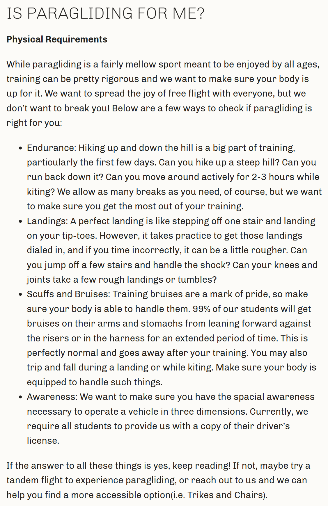 This intro course is great for anyone who's wondering if paragliding is for them, or someone who just wants to try something new and exciting. The cost of this lesson is applied towards your certification course, should you choose to advance in the sport. Which you, y'know, will. It'd be hard not to after you've had your first taste.