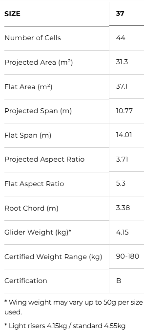 In the air the wing is a solid platform with excellent structural stability to cope with demanding turbulence. The solid and compact nature of the wing is complimented by fun and direct handling -- the brakes are precise with a linear roll response to inputs and a tight turning radius. This agility makes it a fun wing to fly whether you're climbing in XC thermals, or simply descending in smooth air.